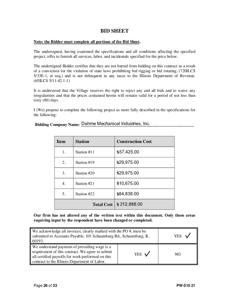 BID SHEET Note: the Bidder must complete all portions of the Bid Sheet. The undersigned, having examined the specifications and all conditions affecting the specified project, offer to furnish all