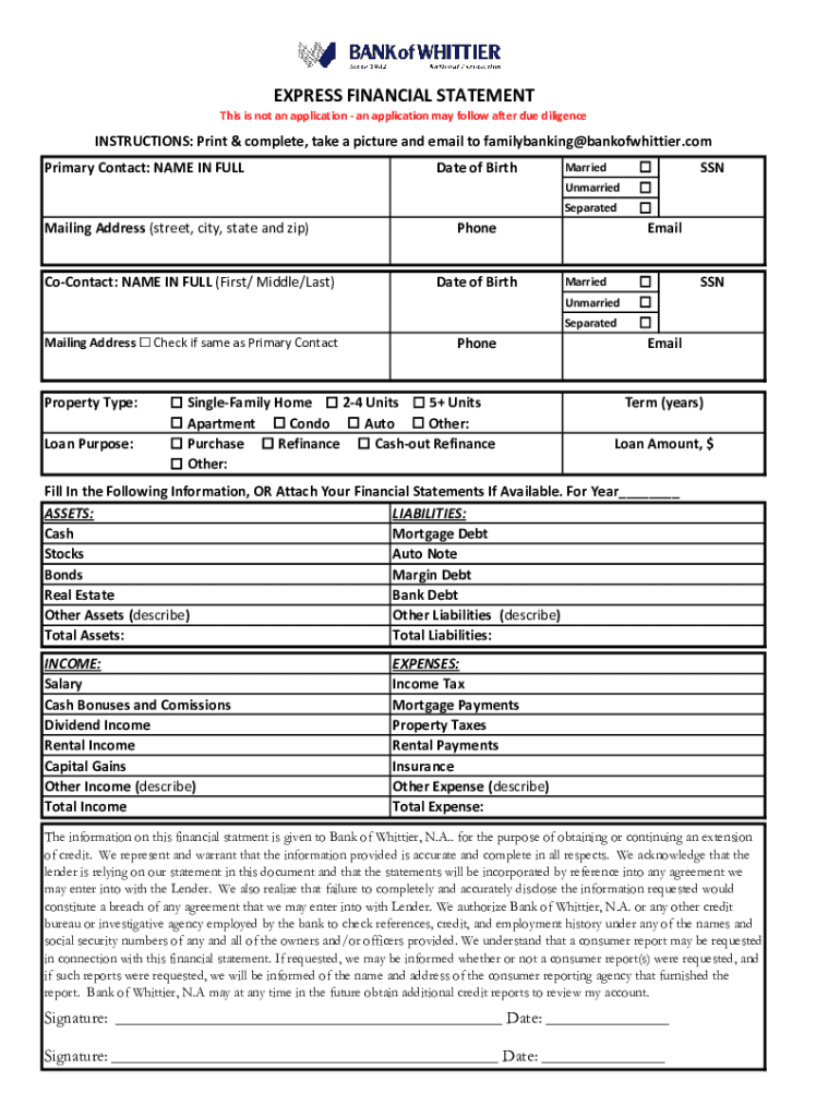 EXPRESS FINANCIAL Statements is not an application may follow after due diligenceINSTRUCTIONS: Print & complete, take a picture and email to familybanking@bankofwhittier.com