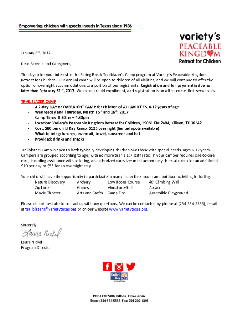 Empowering children with special needs in Texas since 1936January 6th, 2017 Dear Parents and Caregivers, Thank you for your interest in the Spring Break Trailblazers Camp program at Varieties Peaceable