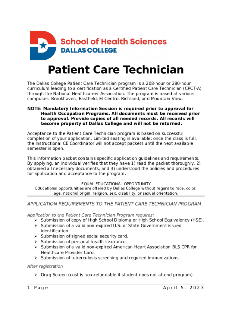 Instructions for the form Vocational Nursing - Patient Care Technician Certificate