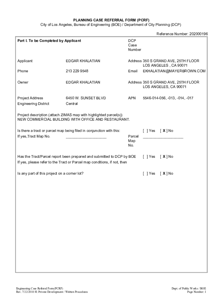 PLANNING CASE REFERRAL FORM (CRF) City of Los Angeles, Bureau of Engineering (BOE) / Department of City Planning (DCP) Reference Number: 202000196 Part I. To be Completed by Applicant DCP Case NumberApplicantEDGAR