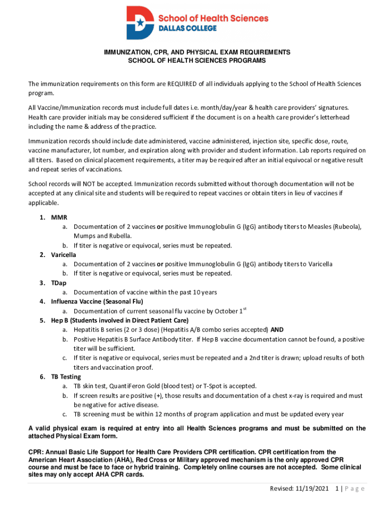 IMMUNIZATION, CPR, AND PHYSICAL EXAM REQUIREMENTS SCHOOL OF HEALTH SCIENCES Programs immunization requirements on this form are REQUIRED of all individuals applying to the School of Health Sciences