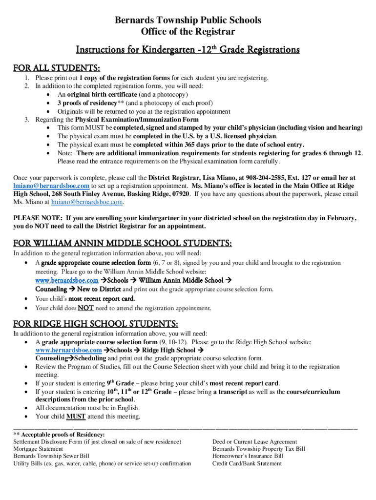 Bernard's Township Public Schools Office of the Registrar Instructions for Kindergarten 12th Grade Registrations FOR ALL STUDENTS: 1. Please print out 1 copy of the registration forms for each student