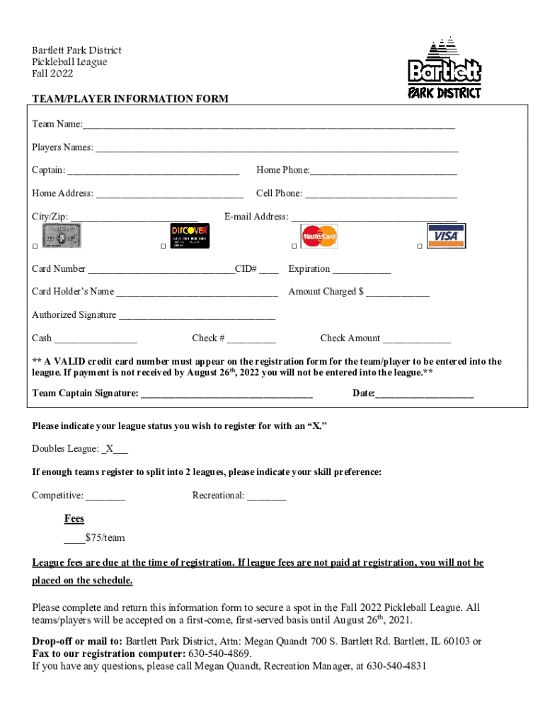 Bartlett Park District Pickleball League Fall 2022 TEAM/PLAYER INFORMATION FORM Team Name:___ Players Names: ___ Captain: ___Home Phone:___Home Address: ___Cell Phone: ___City/Zip: ___ Email Address: