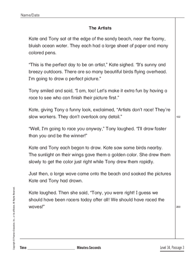 Name/Battle Artists Kate and Tony sat at the edge of the sandy beach, near the foamy, bluish ocean water. They each had a large sheet of paper and many colored pens. This is the perfect day to be