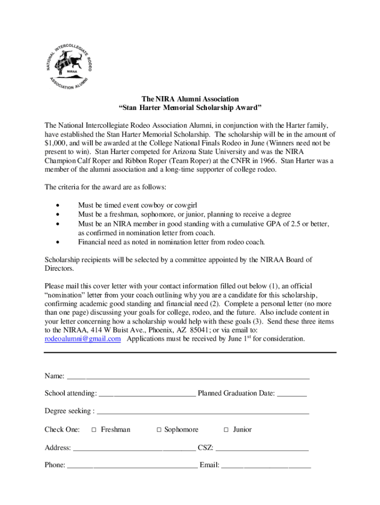 The IRA Alumni Association Stan Charter Memorial Scholarship Award The National Intercollegiate Rodeo Association Alumni, in conjunction with the Charter family, have established the Stan Charter