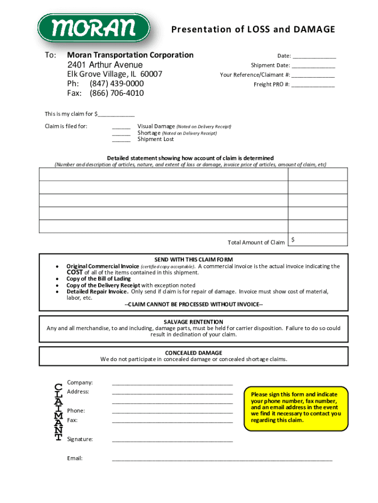 Presentation of LOSS and DAMAGE To:Moran Transportation Corporation 1000 Avenue 2401 Estes Arthur Avenue Elk Grove Village, IL 60007 pH: (847) 4390000 Fax: (866) 7064010Date: ___ Shipment Date: ___