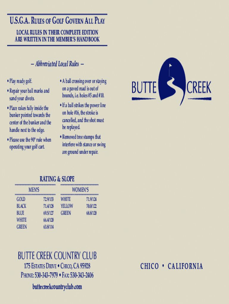 U.S.G.A. RULES OF GOLF Govern ALL Play LOCAL RULES IN THEIR COMPLETE EDITION ARE WRITTEN IN THE MEMBERS HANDBOOK Abbreviated Local Rules Play ready golf. Repair your ball marks and sand your divots.