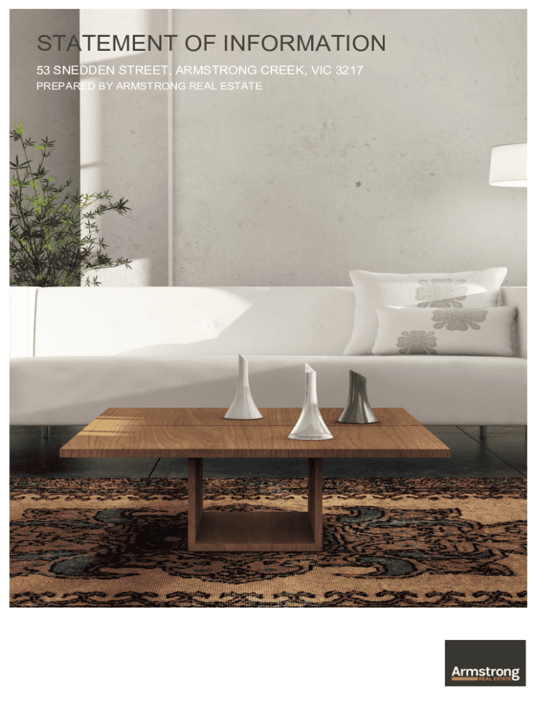 STATEMENT OF INFORMATION 53 SWEDEN STREET, ARMSTRONG CREEK, VIC 3217 PREPARED BY ARMSTRONG REAL ESTATEStatement of InformationSingle residential property located outside the Melbourne metropolitan