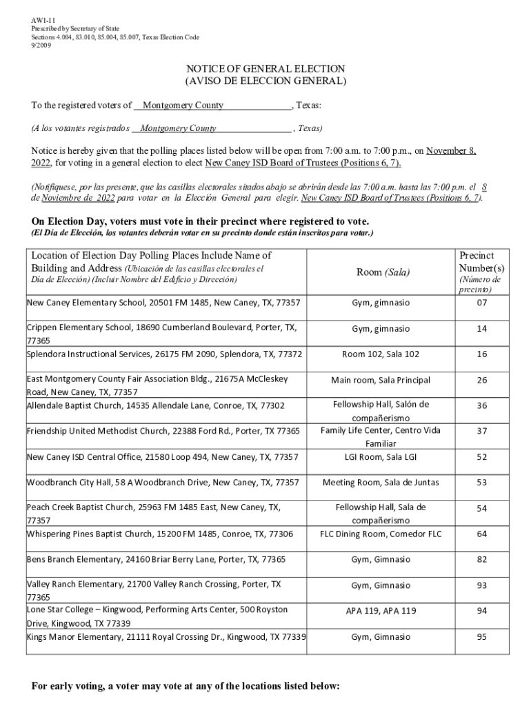 AW111 Prescribed by Secretary of State Sections 4.004, 83.010, 85.004, 85.007, Texas Election Code 9/2009NOTICE OF GENERAL ELECTION (AVIS ODE ELECTION GENERAL) To the registered voters of Montgomery