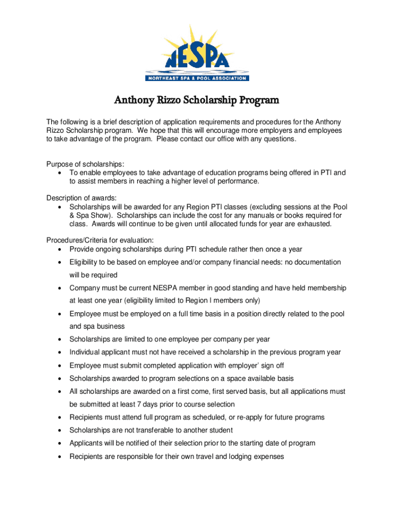 Anthony Rizzo Scholarship Program The following is a brief description of application requirements and procedures for the Anthony Rizzo Scholarship program. We hope that this will encourage more employers