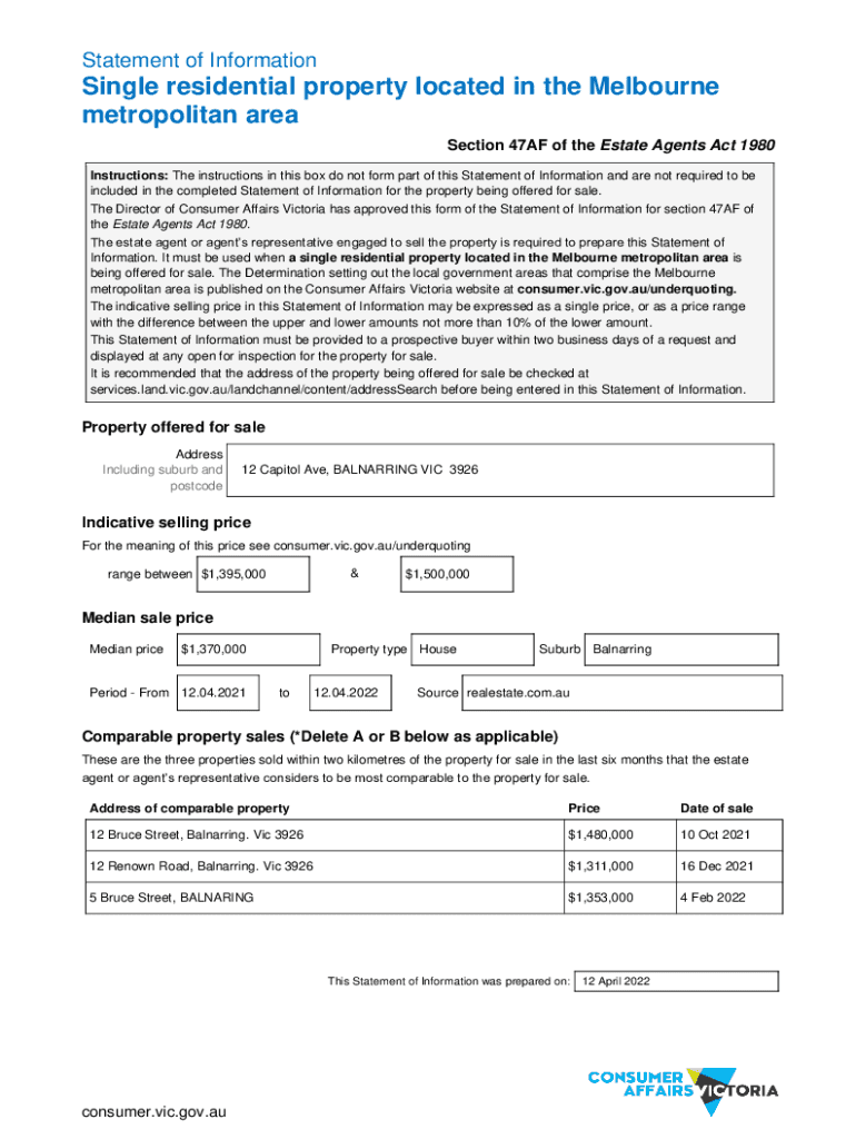Statement of InformationSingle residential property located in the Melbourne metropolitan area Section 47AF of the Estate Agents Act 1980 Instructions: The instructions in this box do not form part