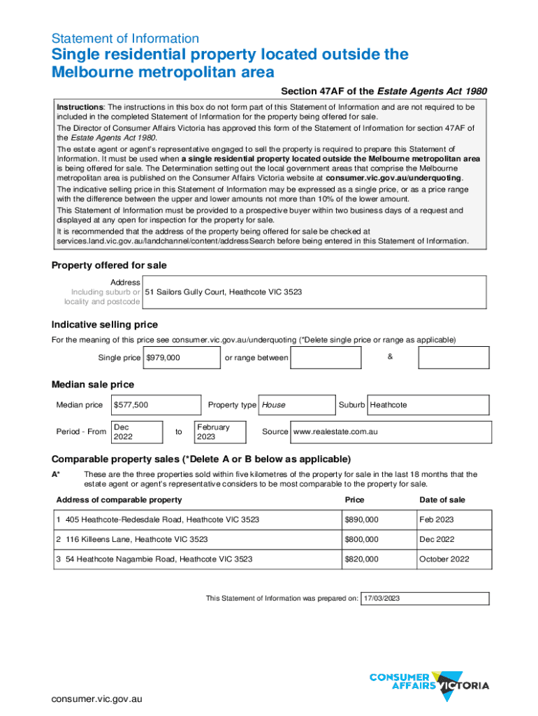 Statement of InformationSingle residential property located outside the Melbourne metropolitan area Section 47AF of the Estate Agents Act 1980 Instructions: The instructions in this box do not form