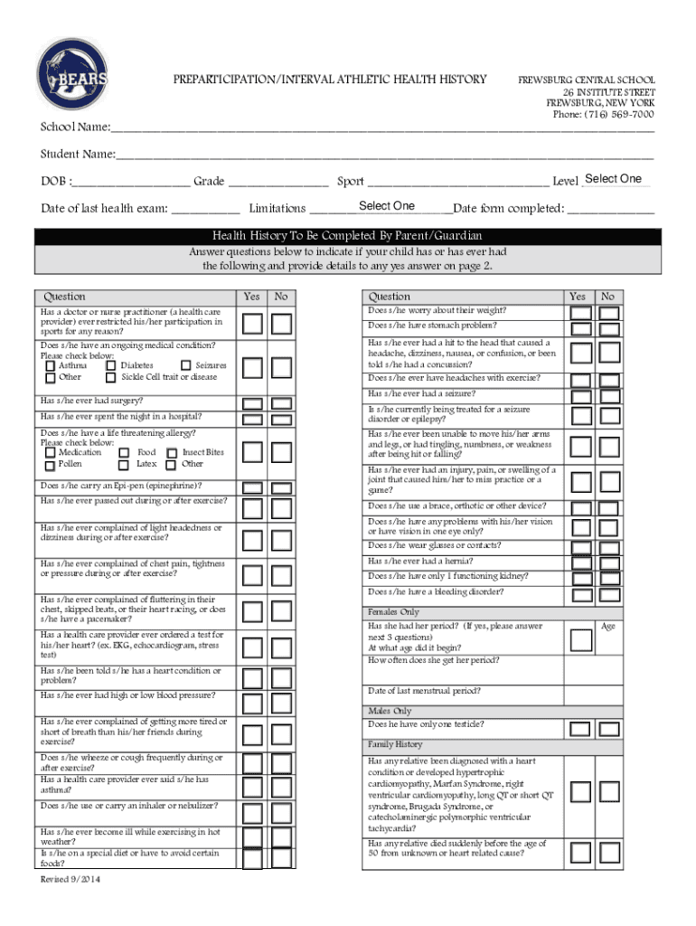 PARTICIPATION/INTERVAL ATHLETIC HEALTH HISTORYFREWSBURG CENTRAL SCHOOL