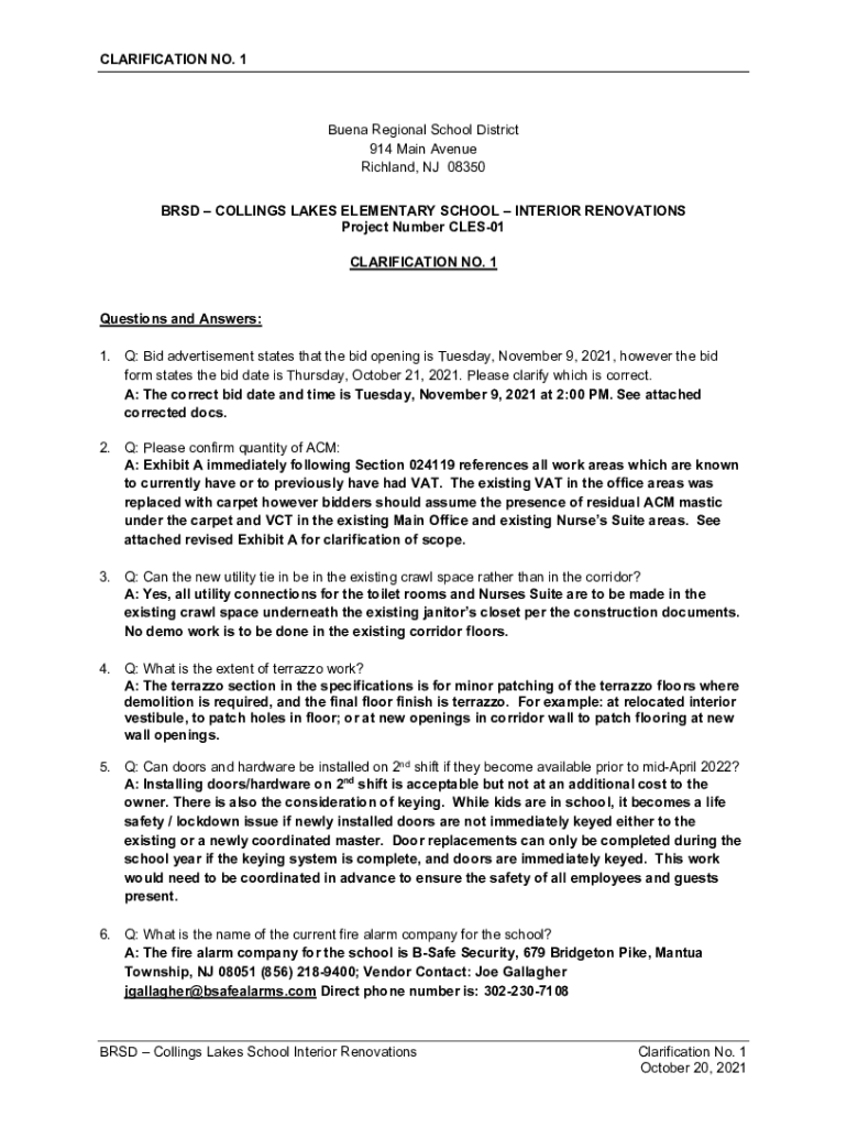 CLARIFICATION NO. 1Buena Regional School District 914 Main Avenue Richland, NJ 08350 BRED COLLINS LAKES ELEMENTARY SCHOOL INTERIOR RENOVATIONS Project Number CLES01 CLARIFICATION NO. 1Questions and