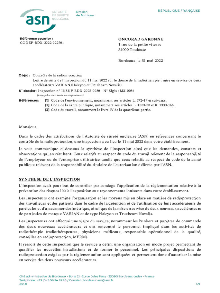OBLIQUE FRANAISERfrence courier :CODEPBDX2022022901ONCORAD ARGONNE 1 rue DE la petite finesse 31000 Toulouse Bordeaux, LE 31 Mai 2022Objet : Control DE la radioprotectionLettre de suite DE inspection