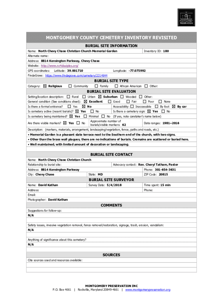 MONTGOMERY COUNTY CEMETERY INVENTORY REVISITED BURIAL SITE INFORMATION Name: North Chevy Chase Christian Church Memorial GardenInventory ID: 180Alternate name: Address: 8814 Kensington Parkway, Chevy