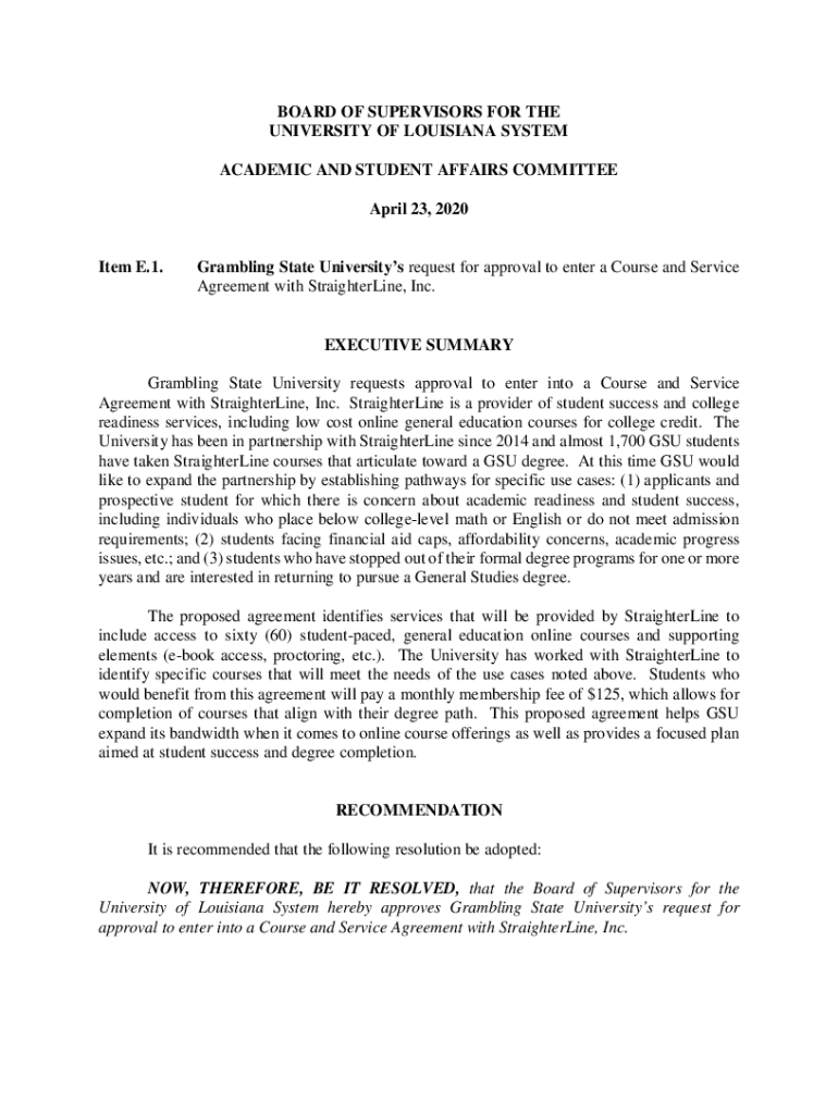 BOARD OF SUPERVISORS FOR THE UNIVERSITY OF LOUISIANA SYSTEM ACADEMIC AND STUDENT AFFAIRS COMMITTEE April 23, 2020Item E.1. Gambling State Universities request for approval to enter a Course and Service