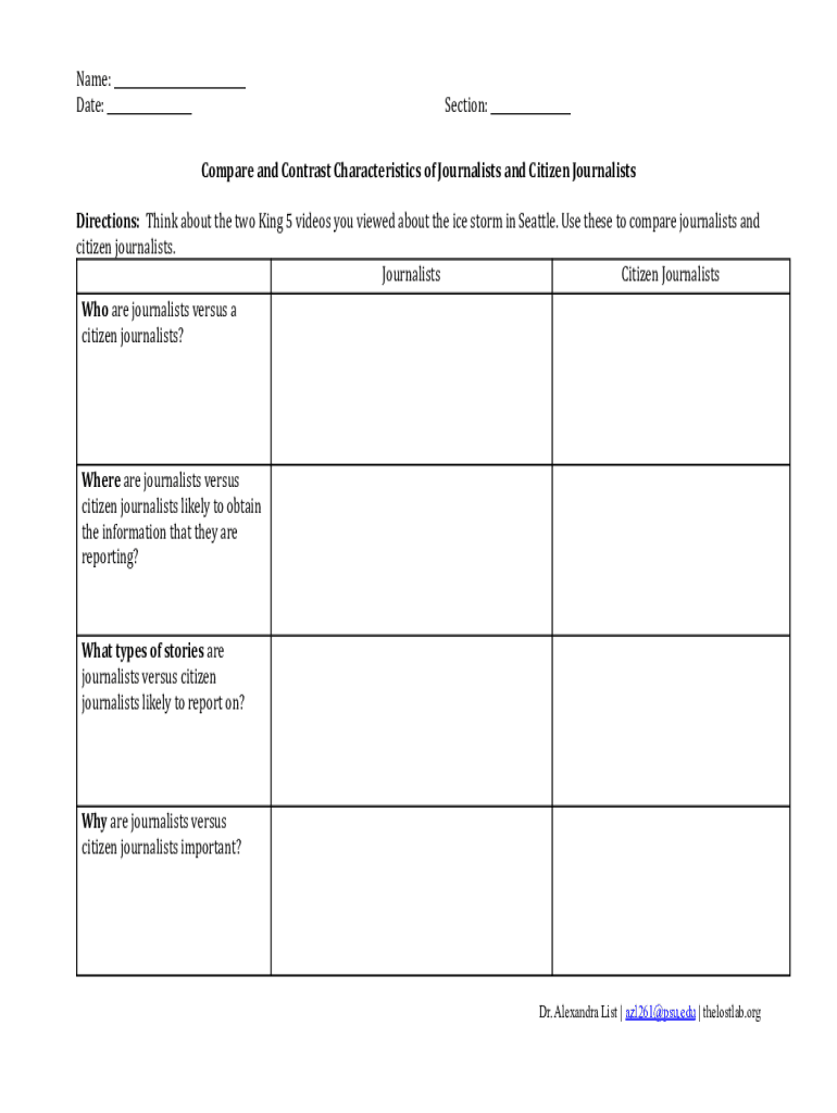 Name: ___ Date: ___Section: ___Compare and Contrast Characteristics of Journalists and Citizen Journalists Directions: Think about the two King 5 videos you viewed about the ice storm in Seattle.