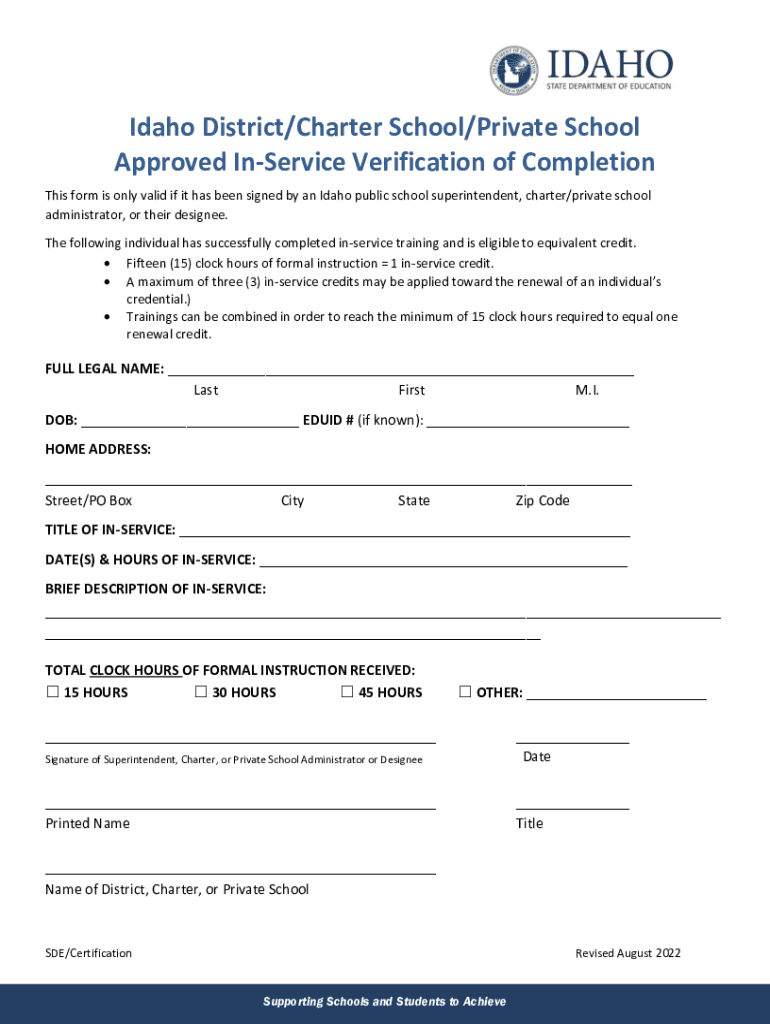 Idaho District/Charter School/Private School Approved In-service Verification of Completion This form is only valid if it has been signed by an Idaho public school superintendent, charter/private