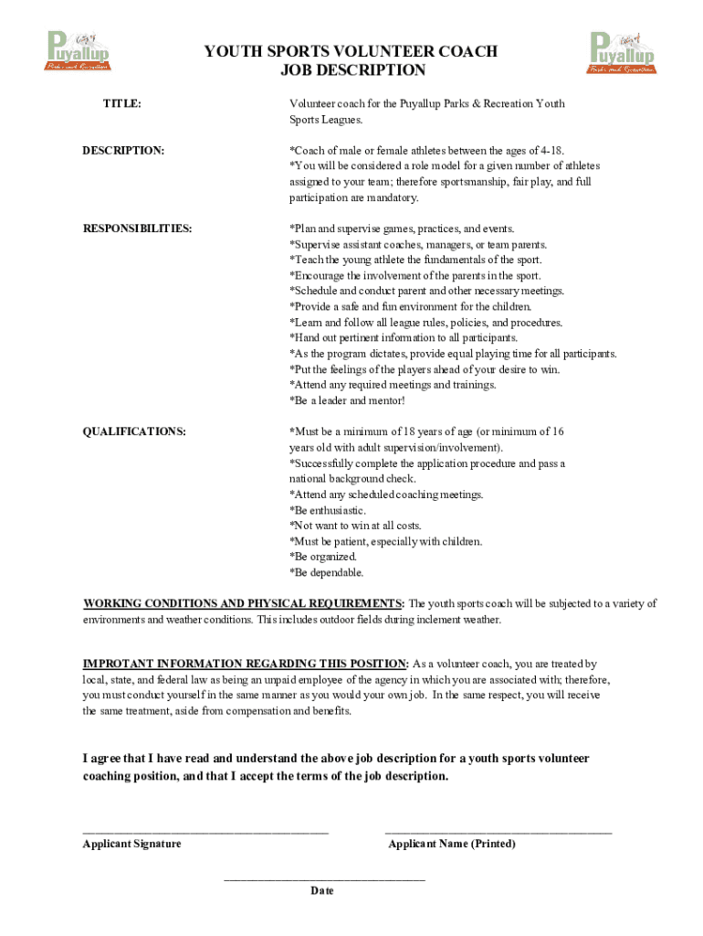 YOUTH SPORTS VOLUNTEER COACH JOB DESCRIPTION TITLE:Volunteer coach for the Puyallup Parks & Recreation Youth Sports Leagues.DESCRIPTION:*Coach of male or female athletes between the ages of 418. *You