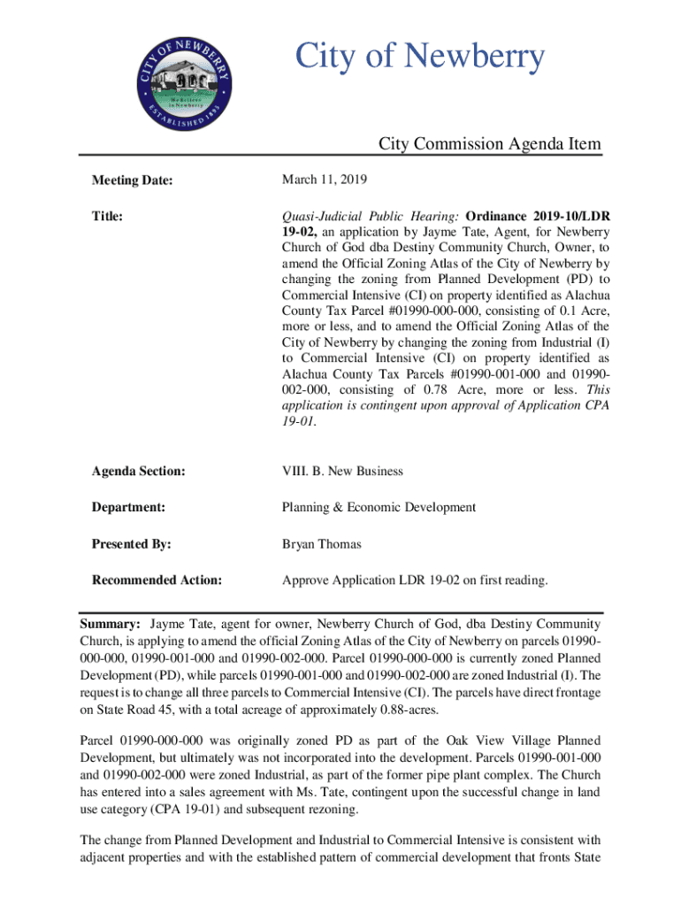 City of Newberry City Commission Agenda Item Meeting Date:March 11, 2019Title:QuasiJudicial Public Hearing: Ordinance 201910/DR 1902, an application by Jayme Tate, Agent, for Newberry Church of God