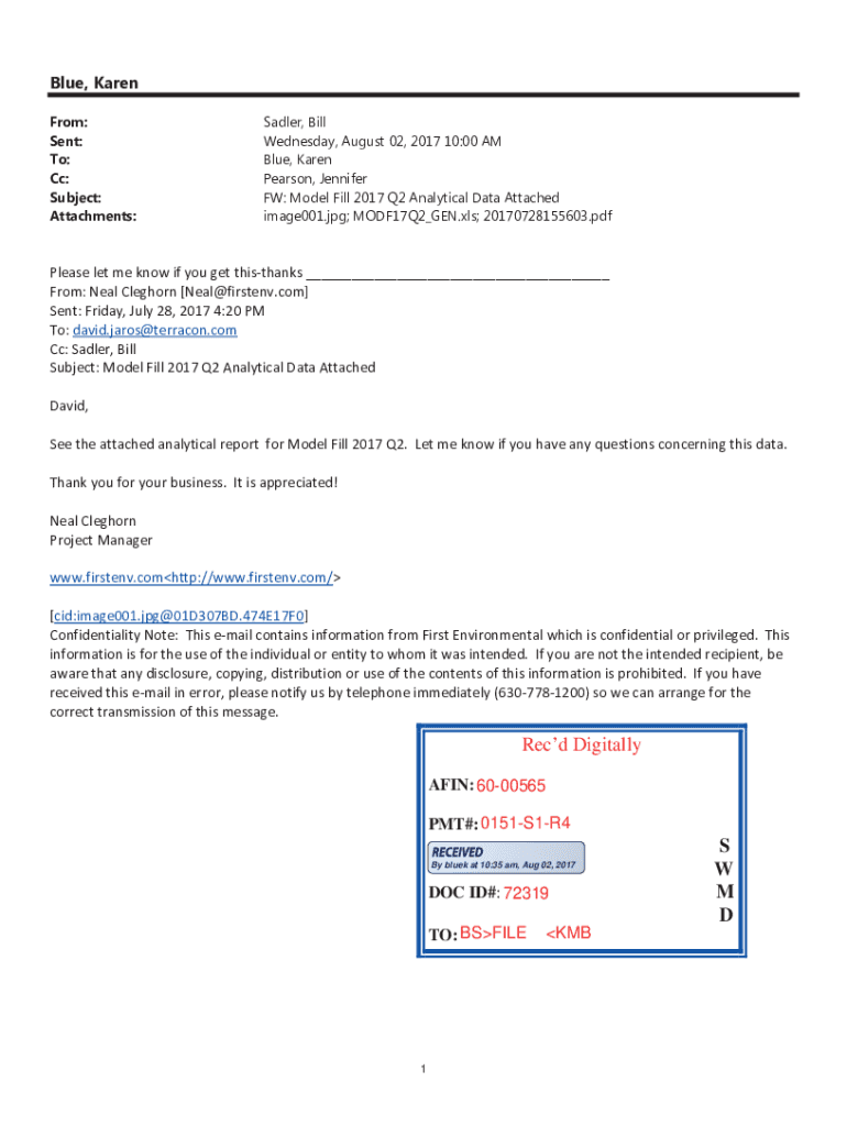 Blue, Karen From: Sent: To: Cc: Subject: Attachments:Sadler, Bill Wednesday, August 02, 2017 10:00 AM Blue, Karen Pearson, Jennifer FW: Model Fill 2017 Q2 Analytical Data Attached image001.jpg; MODF17Q2_GEN.xls;