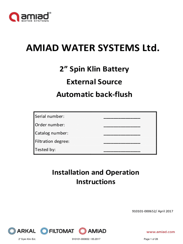 AMID WATER SYSTEMS Ltd. 2 Spin Klein Battery External Source Automatic back flush Serial number:___Order number:___Catalog number:___Filtration degree:___Tested by:___Installation and Operation Instructions910101000652/
