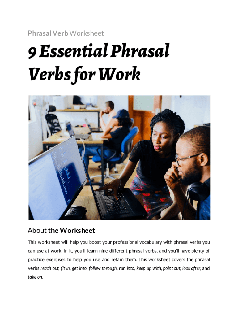 Phrasal Verb Worksheet9 Essential Phrasal Verbs for Work About the Worksheet This worksheet will help you boost your professional vocabulary with phrasal verbs you can use at work. In it, you'll learn