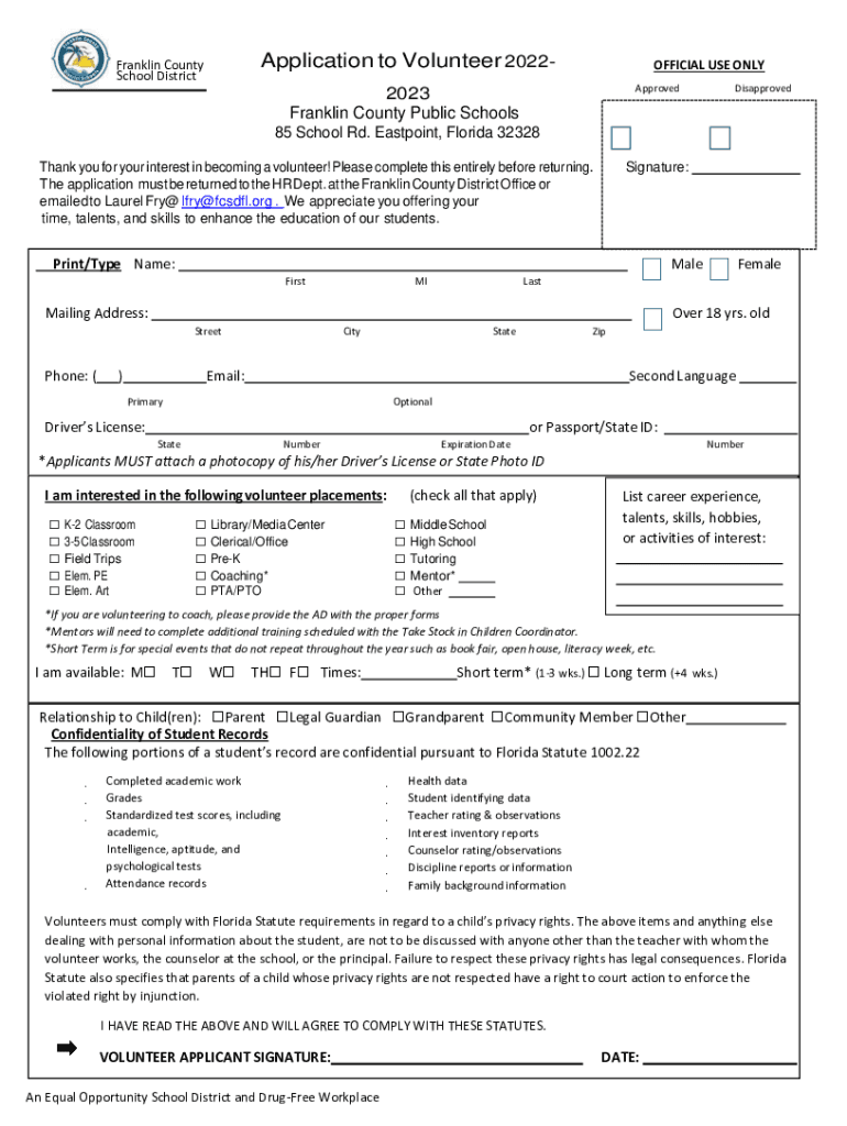 Application to Volunteer 2022Franklin County School DistrictOFFICIAL USE ONLY Approved2023 Franklin County Public SchoolsDisapproved85 School Rd. East point, Florida 32328 Thank you for your interest
