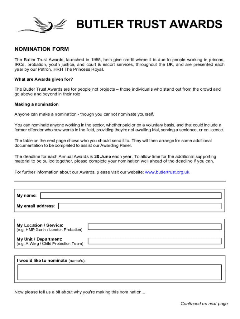BUTLER TRUST AWARDS NOMINATION FORM The Butler Trust Awards, launched in 1985, help give credit where it is due to people working in prisons, IRS, probation, youth justice, and court & escort services,