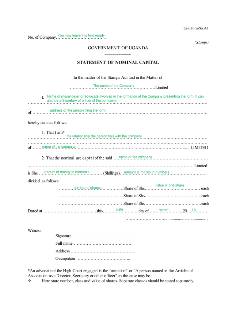 Gen. Form No. A1 You may leave this field empty No. of Company.(Stamp)GOVERNMENT OF UGANDA ___STATEMENT OF NOMINAL CAPITAL ___ In the matter of the Stamps Act and in the Matter of The name of the