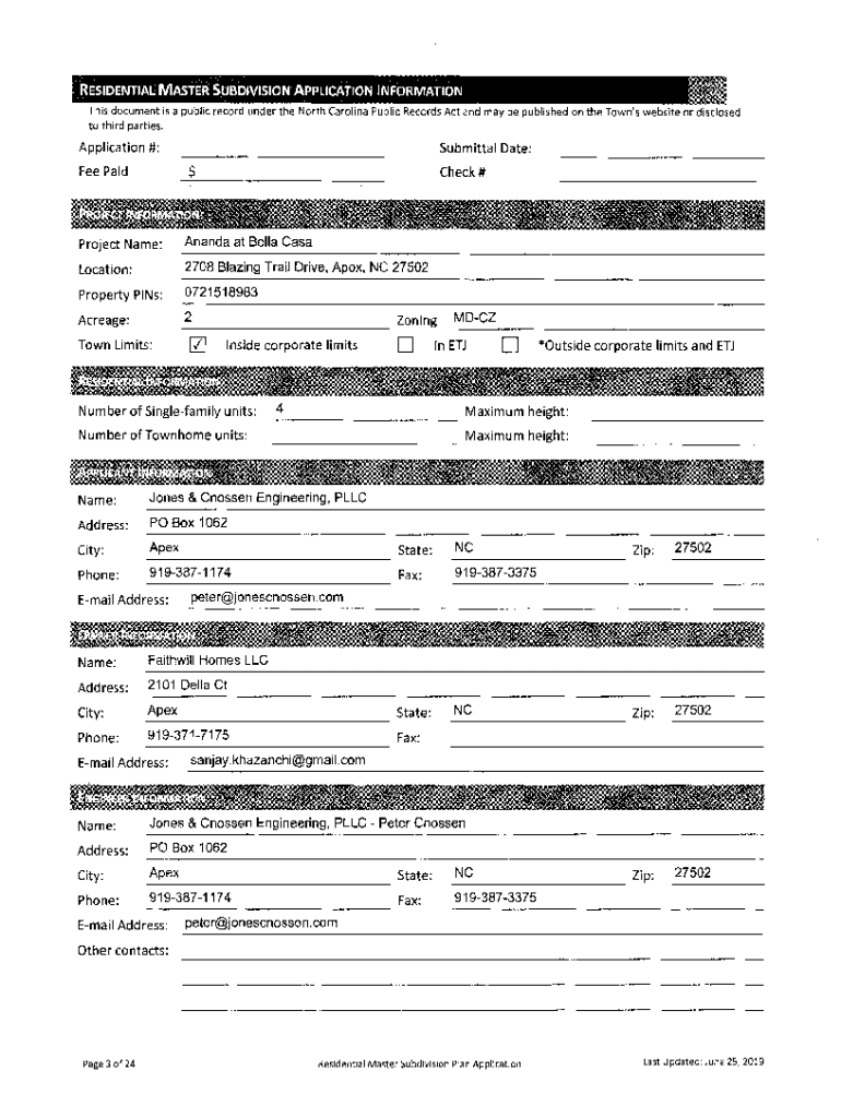 RESIDENTIAL MASTER SUBDIVISION APPLICATION INFORMATION\'. This document is a public record under the North Carolina Public Records Act and may be published on the Town\'s website or disclosed to third