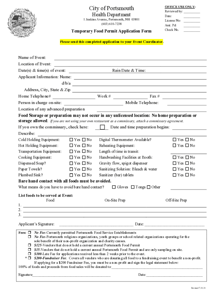 City of Portsmouth Health Department 1 Jenkins Avenue, Portsmouth, NH 03801 (603) 6107238Temporary Food Permit Application FormOFFICE USE ONLY: Reviewed by: ___ Date: ___ License No: ___ Amt. Pd: