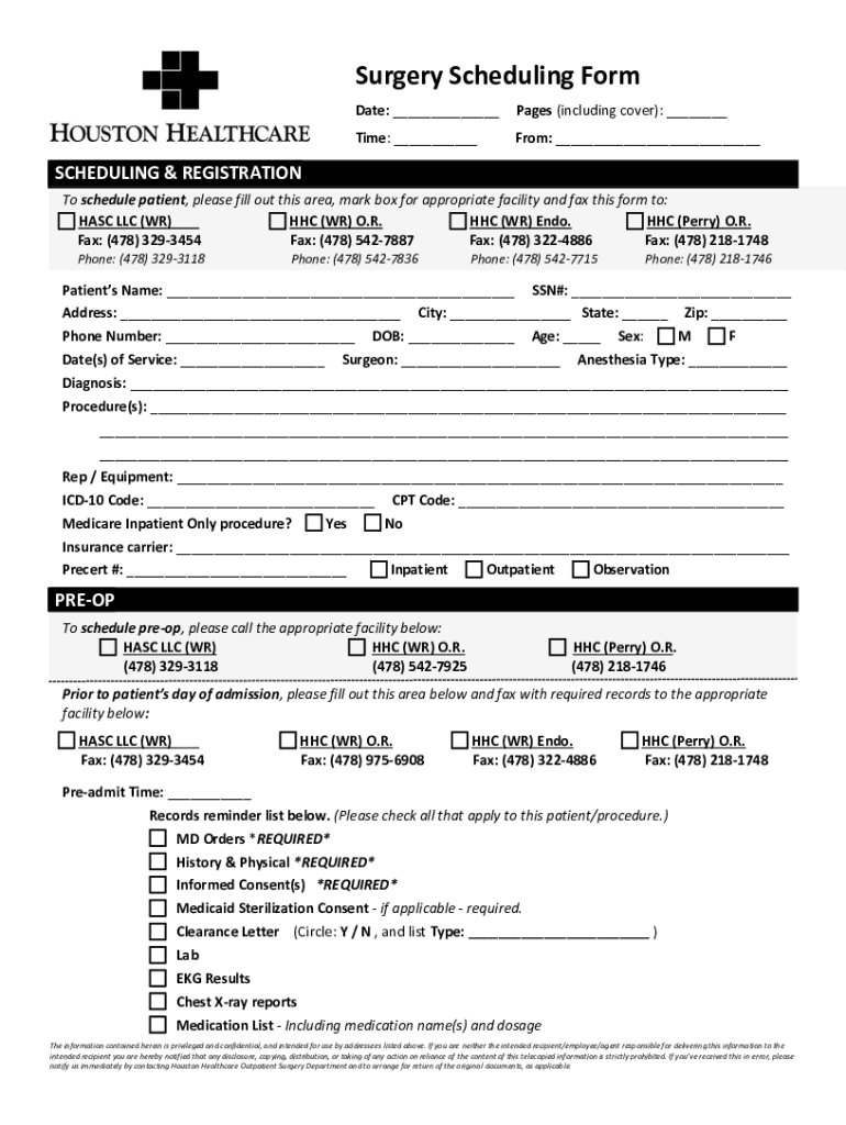 Surgery Scheduling Form Date: ___Pages (including cover): ___Time: ___From: ___SCHEDULING & REGISTRATION To schedule patient, please fill out this area, mark box for appropriate facility and fax this