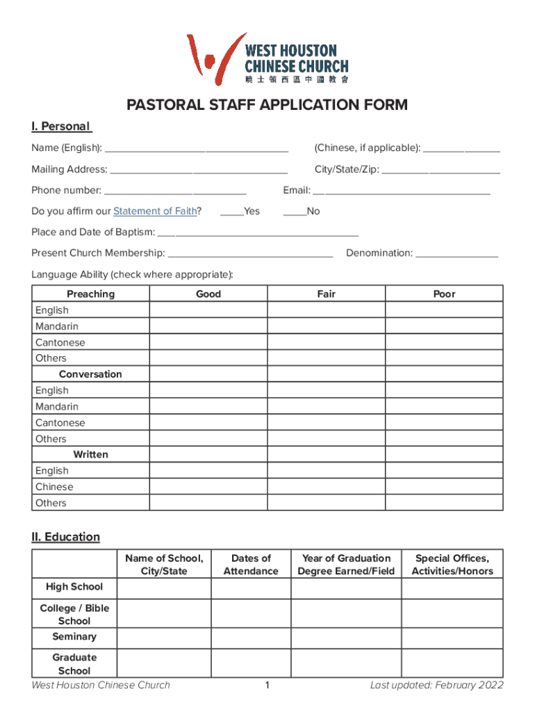 Name (English): ___(Chinese, if applicable): ___Mailing Address: ___City/State/Zip: ___Phone number: ___Email: ___Do you affirm our Statement of Faith? ___Yes___No