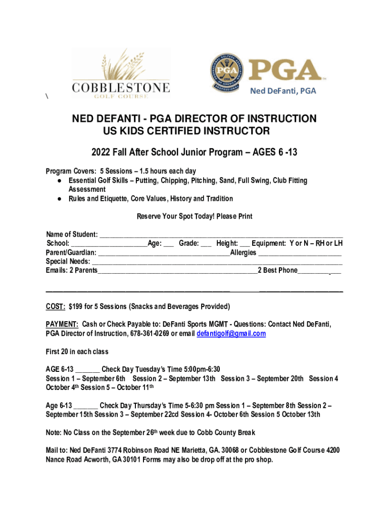 Ned Def anti, PLANED DEFIANT PGA DIRECTOR OF INSTRUCTION US KIDS CERTIFIED INSTRUCTOR 2022 Fall After School Junior Program AGES 6 13 Program Covers: 5 Sessions 1.5 hours each day Essential Golf Skills
