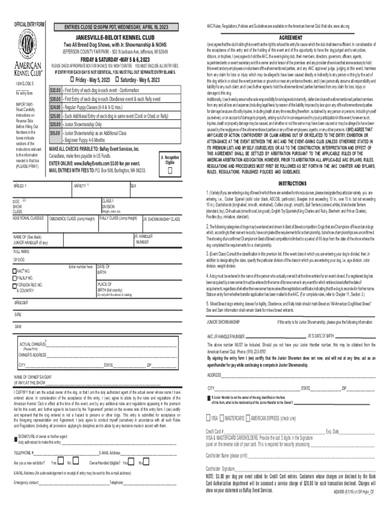OFFICIAL ENTRY COMMENTARIES CLOSE 12:00PM PDT, WEDNESDAY, APRIL 19, 2023JANESVILLEBELOIT KENNEL Club All Breed Dog Shows, with Jr. Showmanship & NHS JEFFERSON COUNTY FAIR PARK 503 N Jackson Ave, Jefferson,