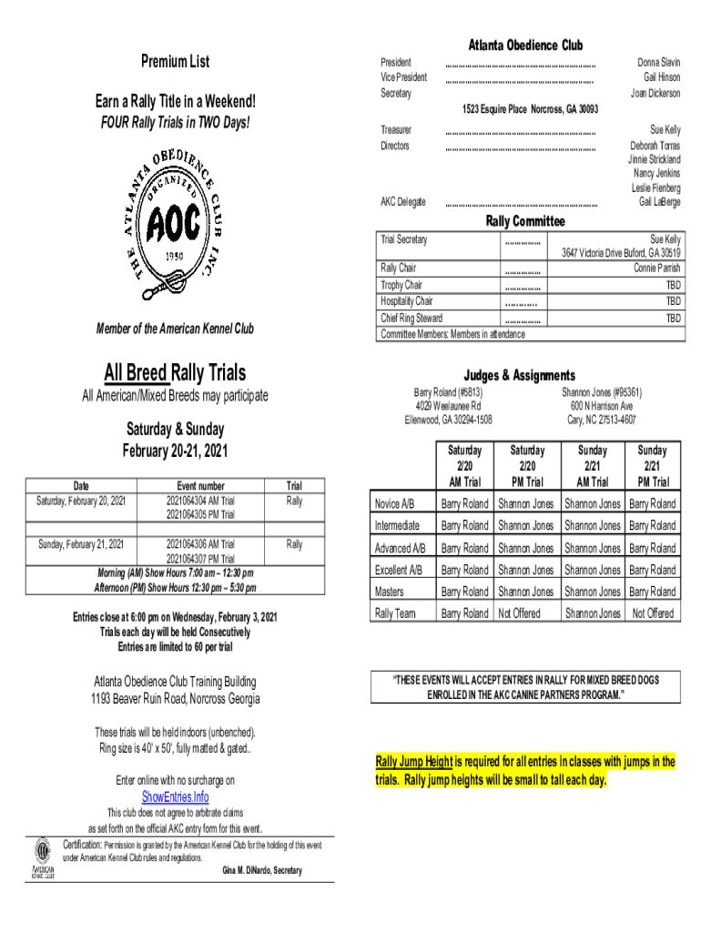 Atlanta Obedience ClubPremium ListPresident Vice President SecretaryEarn a Rally Title in a Weekend!.................................................................... ...................................................................