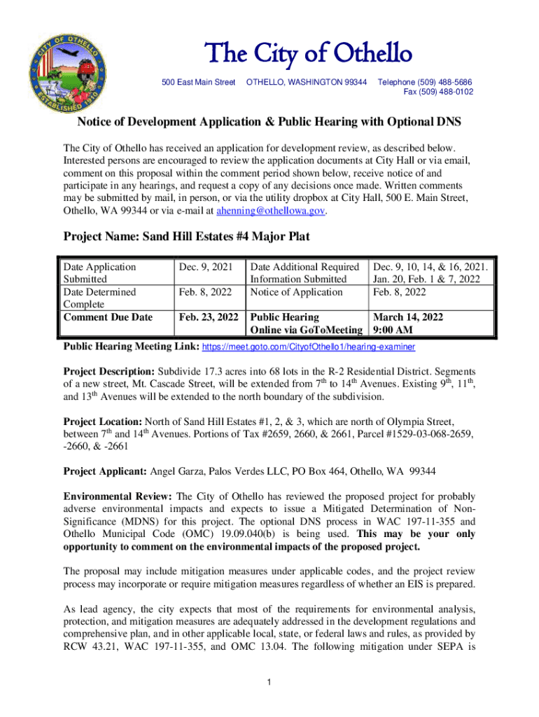 The City of Othello 500 East Main StreetOTHELLO, WASHINGTON 99344Telephone (509) 4885686 Fax (509) 4880102Notice of Development Application & Public Hearing with Optional DNS The City of Othello has