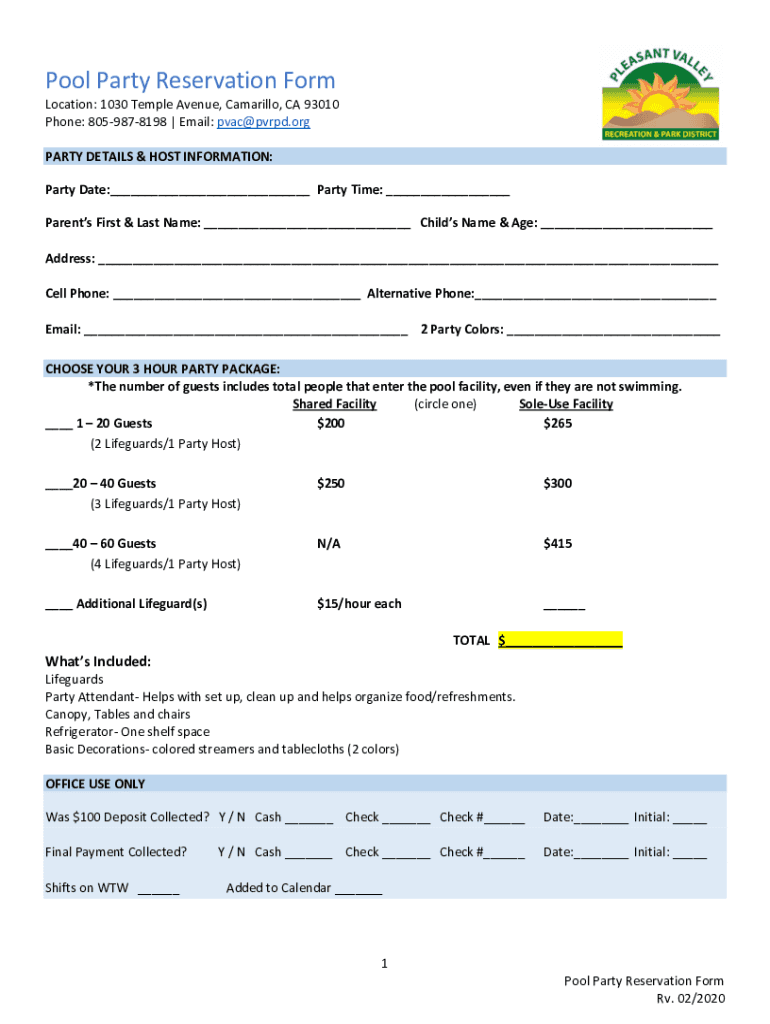 Get the free Pleasant Valley Aquatic Center Pool Party Information Sheet