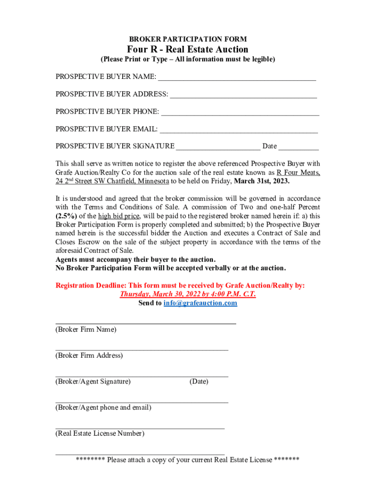 The broker participation form must include details of the transaction, such as the property address, names of the buyer and seller, and the agreed commission percentage.