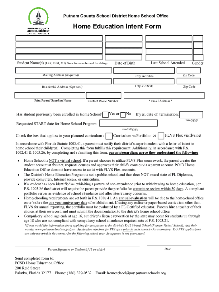 Putnam County School District Home School Officeholder Education Intent FormStudent Name(s) (Last, First, MI)Same form can be used for siblingsLast School AttendedDate of BirthGenderMailing Address