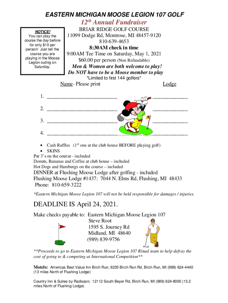 EASTERN MICHIGAN MOOSE LEGION 107 GOLF12th Annual Fundraiser NOTICE! You can play the course the day before for only $10 per person! Just tell the course you are playing in the Moose Legion outing
