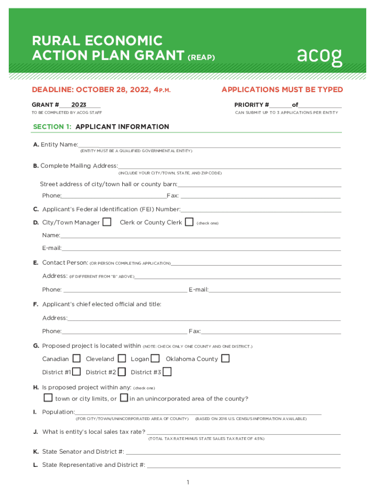 RURAL ECONOMIC ACTION PLAN GRANT (REAP) DEADLINE: OCTOBER 28, 2022:4 P.M. GRANT #APPLICATIONS MUST BE TYPED2023PRIORITY #TO BE COMPLETED BY COG STAFFofCAN SUBMIT UP TO 3 APPLICATIONS PER ENTITYSECTION