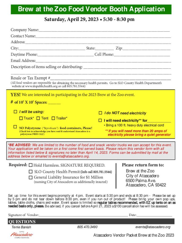 Get the free Brew at the Zoo Food Vendor Booth Application