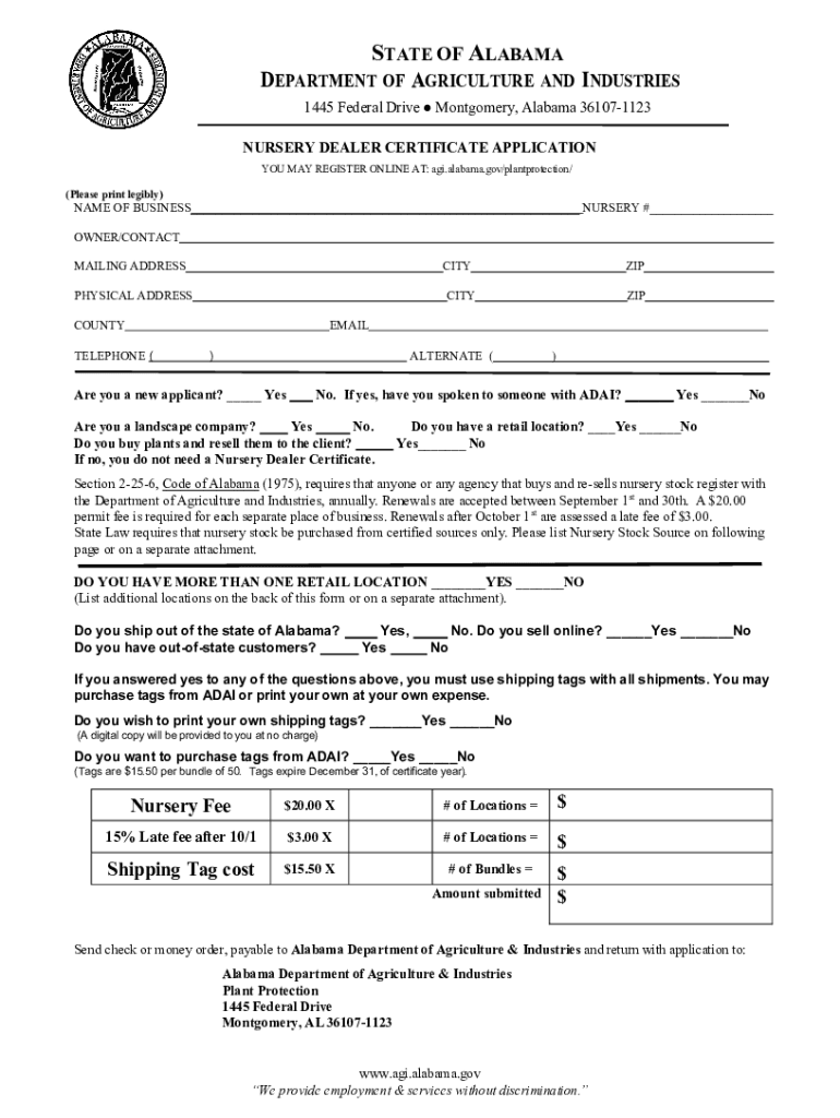 STATE OF ALABAMA DEPARTMENT OF AGRICULTURE AND INDUSTRIES 1445 Federal Drive Montgomery, Alabama 361071123 NURSERY DEALER CERTIFICATE APPLICATION YOU MAY REGISTER ONLINE AT: agi.alabama.gov/plantprotection/