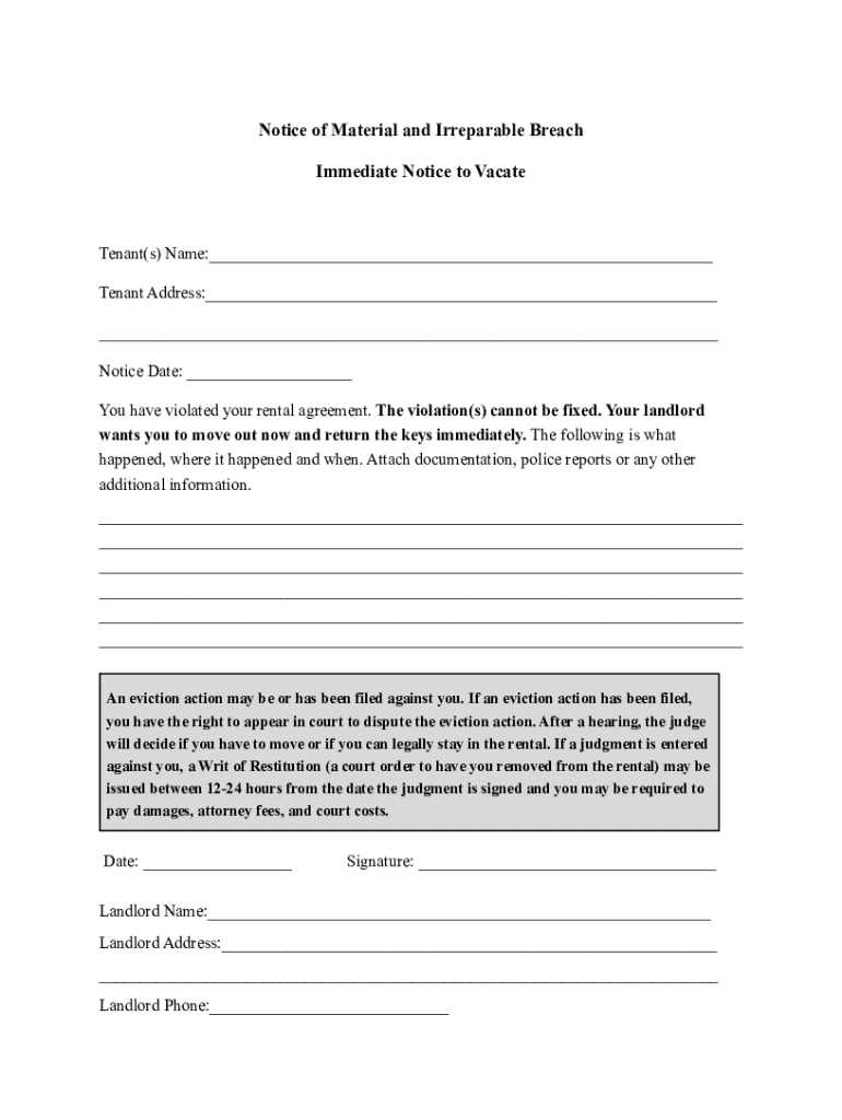 Notice of Material and Irreparable Breach Immediate Notice to VacateTenant(s) Name:___ Tenant Address:___ ___ Notice Date: ___ You have violated your rental agreement. The violation(s) cannot be fixed.