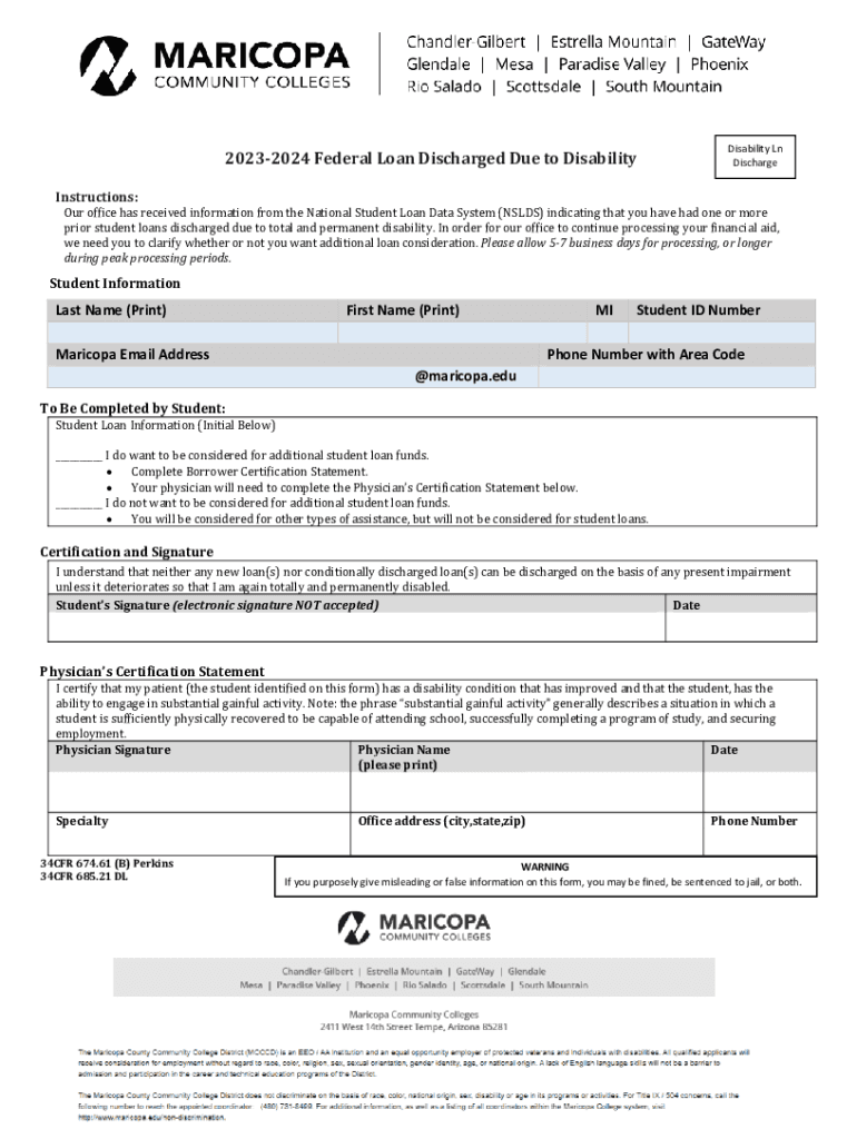 20232024 Federal Loan Discharged Due to DisabilityDisability Ln DischargeInstructions:Our office has received information from the National Student Loan Data System (HOLDS) indicating that you have
