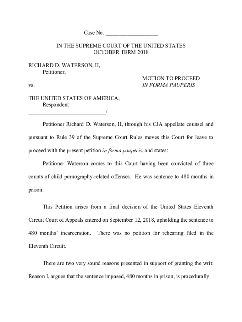 Case No. ___ IN THE SUPREME COURT OF THE UNITED STATES OCTOBER TERM 2018 RICHARD D. PATERSON, II, Petitioner, vs. MOTION TO PROCEED IN FORM PAUPERISM UNITED STATES OF AMERICA, Respondent ___/ Petitioner